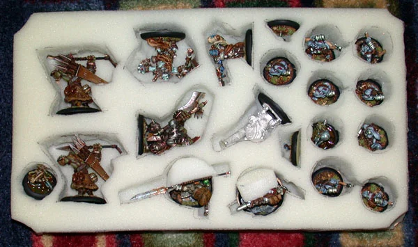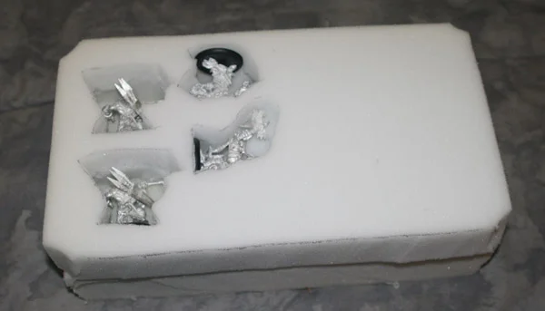 Next you will lay or stand the miniatures on the foam and trace out the outline of figure. If they are standing up you will want to cut all the way through. If they are lying down you will want to leave some foam underneath for protection. If you are cutting through I would recommend once you have the backing glued (see the next step) you label the cardboard in the spaces with the miniature name or number that goes there. If they are units I would number the bottoms of the bases with white paint so you will know where they all gone. It gets confusing once you have 40 or so miniatures out of the trays and you are trying to figure out what goes where…(trust me, I tried!). I even write on the foam with a sharpie now for the ones that I don’t cut all the way through
