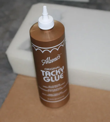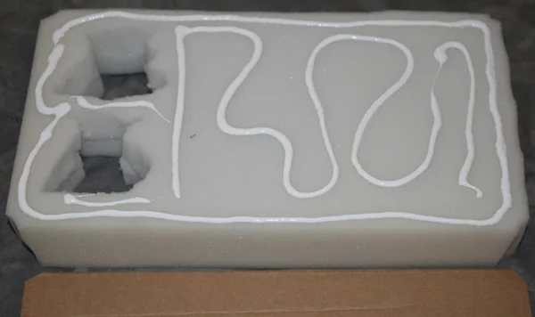 Now, flip your cut foam over and lay down a decent coat of tacky glue. Once you have the glue on, flip it over and lay it on the cardboard you have cut out. I would recommend putting a large heavy book on top of the foam until the glue dries (it will take 3-4 at the shortest).