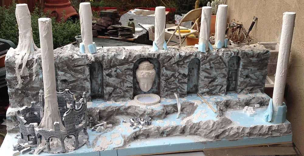 Jumping ahead a little bit. After layering up the foam board, I carved it up using a compination of hot wire cutter and long sharp knife. After that I textured the faces with concreet patch. This will give it some texture along with toughening up the surface.