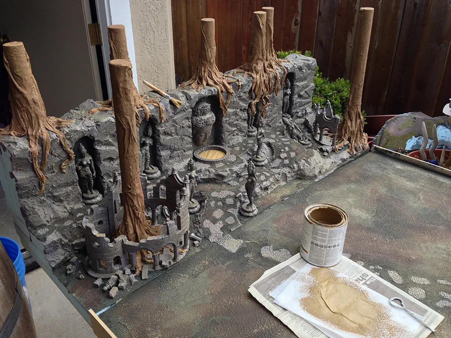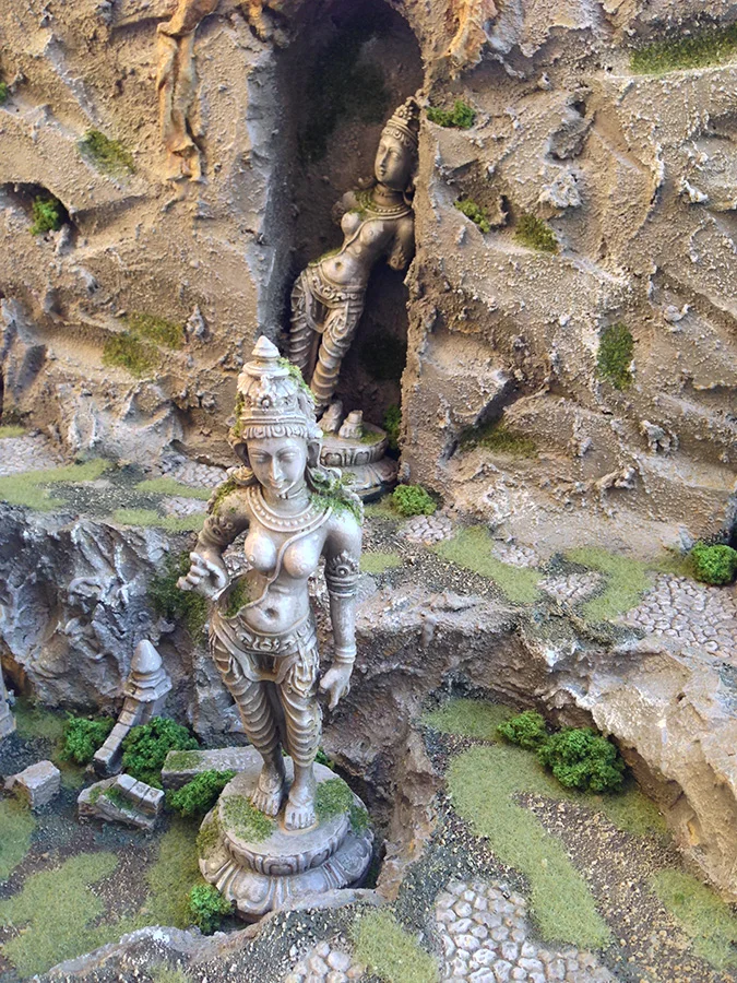 Some of the statues in their alcoves. For the texture on the flat surfaces I put down a thick layer of paint and covered it with sand. I just use cheap latex house paint. It is nice and turable and thick enough for sand to stick to easily.