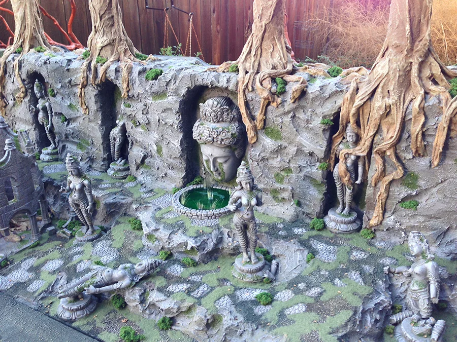 There will be a path way that leads up to the statues and the pool that is below the big face in the center.