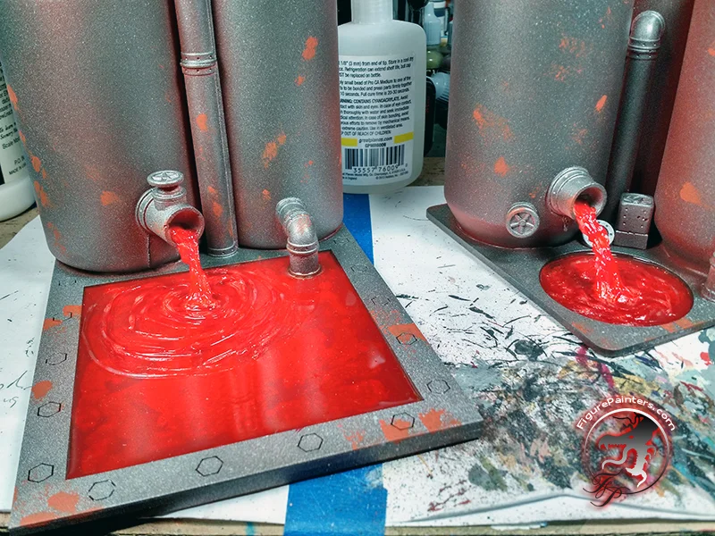 I started off with painting the inside of the pool a mottled red. This will add some depth and texture to the pool once the resin is in. I tinted the clear resin with some red tamaya clear paint. The pouring liquid I have a support of fishing line.